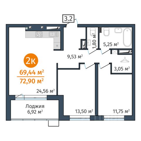 Планировка точная и разумная — как хороший мотив: просторная кухнягостиная 19,7 м², где удобно собирать гостей и одновременно готовить, две правильной формы комнаты 12,3 и 11,3 м² — одна из них легко становится мастерспальней, другая — детской или камерным кабинетом. Два санузла (приблизительно 3,8 и 3,5 м²) — редкая приятность в городской квартире; лоджия/балкон 3,9 м² даёт дополнительную интимную террасунишу для растений и утра с чашкой кофе. Прихожие и ниши продуманы для хранения — место для аккуратного гардероба и техники, ничего не мешает глазу и движению. Планировка по сути — "игра на контрастах": простор для общения и уют для уединения, всё по правилам современной жизни.