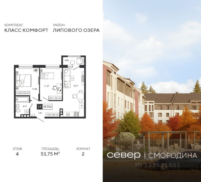 Продаётся квартира площадью 53.75 м2 в жилом комплексе "Смородина". Квартира находится на 4 этаже, жилая площадь квартиры 22.4 м2, площадь просторной кухни — м2. Среди особенностей планировки — изолированные комнаты с окнами на одну сторону, 1 совмещённый санузел. Срок сдачи — IV кв. 2026 Жилой комплекс "Смородина" — это: - уютный малоэтажный комплекс в районе ММС - дома высотой 4 этажа - квартиры от студий до семейных вариантов с отапливаемыми лоджиями - экологичные материалы в благоустройстве территории Окружение В 5 минутах ходьбы от проекта — озеро Липовое с песчаным пляжем и лесопарковая зона. Инфраструктура В шаговой доступности есть все для комфортной жизни: школы, детские сады, магазины и аптеки. Рядом с проектом — остановка общественного транспорта. Благоустройство Прямо во дворе — собственные грядки для жителей, где можно выращивать зелень и цветы. Для детей оборудованы детские площадки из натуральных материалов. Лобби Вдохновленные современными тенденциями наши парадные разработаны с акцентом на эстетическую привлекательность и практичность. Использование натуральных материалов и ярких цветовых акцентов создает атмосферу уюта и стиля. Планировки Среди многообразия продуманных планировок есть и уютные студии, и просторные семейные варианты. Во всех квартирах предусмотрены отапливаемые лоджии, где можно устроить зону отдыха или рабочий кабинет.