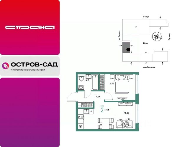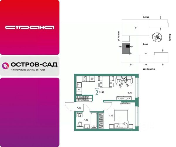 Новая квартира в ЖК "Остров-сад" напрямую от федеральной группы компаний "Страна Девелопмент". Финансовый партнер — Сбербанк России. Продается 2комнатная квартира на 8 этаже от застройщика Страна Девелопмент. Площадь квартиры 30,89 кв. м. ЖК "ОСТРОВ-САД" Жилой комплекс ЖК "Остров-сад" — новый квартал в районе ДОК в Тюмени недалеко от центра. Внутри ЖК планируется несколько школ и детсадов, торговая галерея, своя набережная, закрытые дворы-сады, несколько подземных и многоуровневых паркингов и пешеходный бульвар. Архитектура комплекса отсылает к истории ДОКа — отделка из красного кирпича, акцентные цвета штукатурки и необычная ступенчатая форма зданий. Всё для комфортной жизни на своём "острове" рядом с центром Тюмени. ПРЕИМУЩЕСТВА Квартиры с готовым ремонтом, возможность приобрести квартиру с кухонным гарнитуром и техникой. Развитое жилое пространство — закрытые дворы-сады, свои набережная и бульвар, торговая галерея на 1-м этаже, рядом детсады, школы и поликлиника. Служба охраны и видеонаблюдение в доме и во дворе 24/7. Несколько многоуровневых и подземных паркингов с охраной. ОТДЕЛКА Необходимые работы уже выполнены: подведены холодная, горячая вода и электричество, установлены батареи. В квартире не проводились отделочные работы: не выровнены стены и пол. ДИЗАЙНЕРСКАЯ ОТДЕЛКА В ЖК "Остров-сад" есть квартиры с готовым ремонтом. Пять вариантов на выбор в разных цветовых решениях. В ремонт также включены светильники, межкомнатные двери и даже кондиционер. Можно выбрать отдельно ремонт в ванной, для вас 4 стильных варианта с сантехникой. СПОСОБЫ ПОКУПКИ Сотрудники "Страна Девелопмент" будут сопровождать вас на каждом этапе сделки, помогут получить одобрение по ипотеке или снизить ежемесячный платеж. - ипотека - материнский капитал - 100% оплата наличными - рассрочка от застройщика 0%