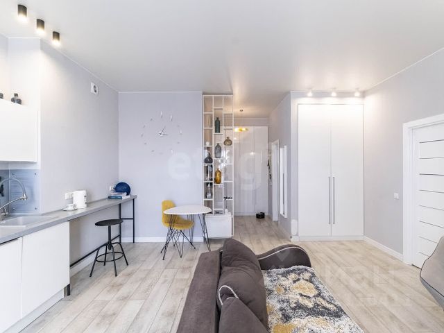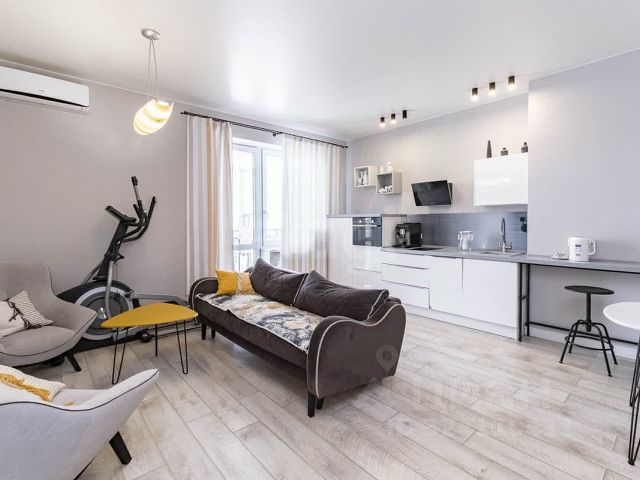 1 кухня-гостиная - кухонный гарнитур со встроенной техникой-холодильник, посудомойка, духовка (с функцией СВЧ), вытяжка, встроенный фильтр для воды, кондиционер, диван, шторы, часы настенные