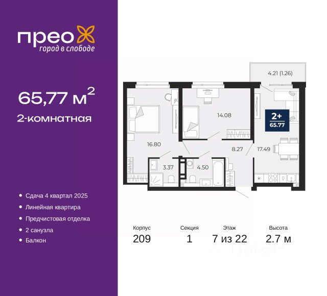 Продается двухкомнатная квартира с предчистовой отделкой в ЖК "Прео" на 20 этаже. Общая площадь: 54.64 кв.м., жилая: 26.99 кв.м., площадь просторной кухни-столовой: 13.51 кв.м. Комнаты изолированные, все окна выходят на одну сторону. В квартире одна лоджия, один совмещенный санузел. Высота потолков 2.7 м. Дом монолитный, черырехподъездный, переменной этажности, от 14 до 21 этажей. Квартира находится во 2-й секции высотой 21 этаж в корпусе 211. На этаже 10 квартир. В подъезде 1 пассажирский и 1 грузовой лифт. Окончание строительства - 4 квартал 2026 года. Оформление сделки по договору долевого участия. Преображенский — один из самых привлекательных районов для жизни! Это полностью самостоятельный жилой район с точки зрения инфраструктуры. Преображенский находится между Московским и Червишевским трактами в квартале улиц Закалужская — Вьюжная — Александра Протозанова. Не нужно ждать, когда появится инфраструктура — переезжайте на всё готовое. Вблизи расположены действующие школа и детский сад. В этом году откроется еще один сад, а в следующем году — школа. По соседству с Преображенским запланировано строительство городского парка "Комарово" площадью 38 гектар. За 10 минут можно доехать на автомобиле до крупных ТРЦ: "Лента", "Кристалл", "Леруа Мерлен", "Метро" и "Ашан". С 2018 года в районе открыт Соседский центр — пространство, созданное для формирования добрососедской среды, совместного досуга, общения и реализации соседских инициатив. Здесь проходят встречи соседей, а также сами жители района организовывают мероприятия. Организатором такого события может стать любой желающий. В квартирах выполнена качественная предчистовая отделка. Гладкие стены с финишным выравниванием по маякам. Ровный потолок для установки натяжного потолка. Установлены пятикамерные окна с двойным стеклопакетом (3 стекла). Дизайнерские холлы с видеонаблюдением, безбарьерным и прозрачным входом всегда светло и спокойно. На первом этаже есть просторные колясочные, где все жители могут оставлять свои коляски и велосипеды. В Преображенском есть всё, что нужно для активного отдыха и занятий спортом. Мы сделали большое футбольное поле с безопасным покрытием. Также установили хоккейный корт, который оборудован по всем необходимым стандартам. Во дворах можно делать упражнения на специальных площадках с турниками. Весь район мы обустроили велодорожками, которые связаны в единый маршрут. У нас есть сухие фонтаны, бьющие из земли, деревья, веревки, сетки, скалодром, газон, песок и резинка — осталось просто дать своему ребенку право на свободную игру. По-настоящему хорошие дворы — это те, которые дети предпочитают соцсетям и телевизору. Аккредитация в банках: ПАО Банк "ВТБ", ПАО "Газпромбанк", "Сбербанк России", ОАО "Альфа-Банк", ПАО "Банк Уралсиб" и других. #zs0aCa