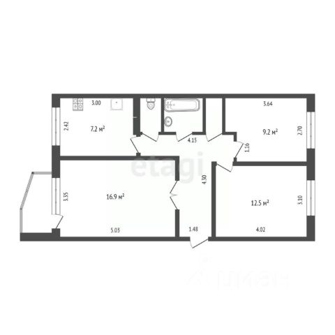 • Санузел: совмещённый, стены облицованы керамической плиткой, на полу — кафель.
