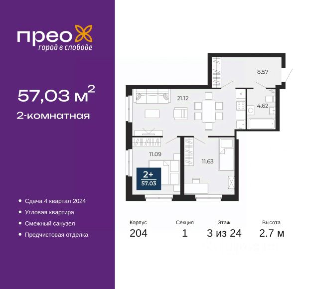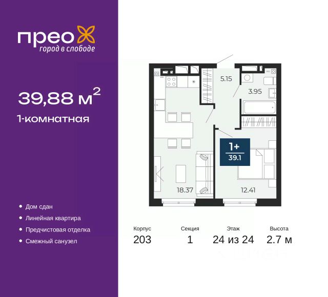 Просторная однокомнатная квартира с предчистовой отделкой в ЖК "Прео" на 3 этаже. Общая площадь: 37.25 кв.м., жилая: 11.07 кв.м., площадь просторной кухни-столовой: 17.77 кв.м. Все окна выходят на одну сторону. В квартире один совмещенный санузел. Высота потолков 2.7 м. Квартира находится в корпусе 203. Дом монолитный, одноподъездный, высотой 24 этажа. На этаже 14 квартир. В подъезде 2 грузовых лифта. В настоящее время строительство завершено, дом сдан в 4 квартале 2024 года. Оформление сделки по договору купли-продажи. Преображенский — один из самых привлекательных районов для жизни! Это полностью самостоятельный жилой район с точки зрения инфраструктуры. Преображенский находится между Московским и Червишевским трактами в квартале улиц Закалужская — Вьюжная — Александра Протозанова. Не нужно ждать, когда появится инфраструктура — переезжайте на всё готовое. Вблизи расположены действующие школа и детский сад. В этом году откроется еще один сад, а в следующем году — школа. По соседству с Преображенским запланировано строительство городского парка "Комарово" площадью 38 гектар. За 10 минут можно доехать на автомобиле до крупных ТРЦ: "Лента", "Кристалл", "Леруа Мерлен", "Метро" и "Ашан". С 2018 года в районе открыт Соседский центр — пространство, созданное для формирования добрососедской среды, совместного досуга, общения и реализации соседских инициатив. Здесь проходят встречи соседей, а также сами жители района организовывают мероприятия. Организатором такого события может стать любой желающий. В квартирах выполнена качественная предчистовая отделка. Гладкие стены с финишным выравниванием по маякам. Ровный потолок для установки натяжного потолка. Установлены пятикамерные окна с двойным стеклопакетом (3 стекла). Дизайнерские холлы с видеонаблюдением, безбарьерным и прозрачным входом всегда светло и спокойно. На первом этаже есть просторные колясочные, где все жители могут оставлять свои коляски и велосипеды. В Преображенском есть всё, что нужно для активного отдыха и занятий спортом. Мы сделали большое футбольное поле с безопасным покрытием. Также установили хоккейный корт, который оборудован по всем необходимым стандартам. Во дворах можно делать упражнения на специальных площадках с турниками. Весь район мы обустроили велодорожками, которые связаны в единый маршрут. У нас есть сухие фонтаны, бьющие из земли, деревья, веревки, сетки, скалодром, газон, песок и резинка — осталось просто дать своему ребенку право на свободную игру. По-настоящему хорошие дворы — это те, которые дети предпочитают соцсетям и телевизору. Аккредитация в банках: "Сбербанк России", ПАО Банк "ВТБ", ПАО "Банк Уралсиб", ОАО "Альфа-Банк", ПАО "Газпромбанк" и других. #ZmsfVZ