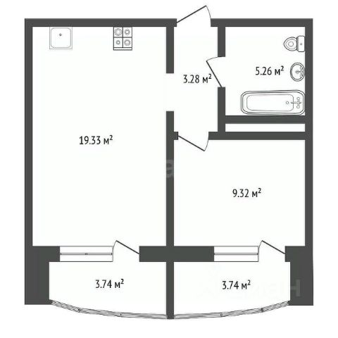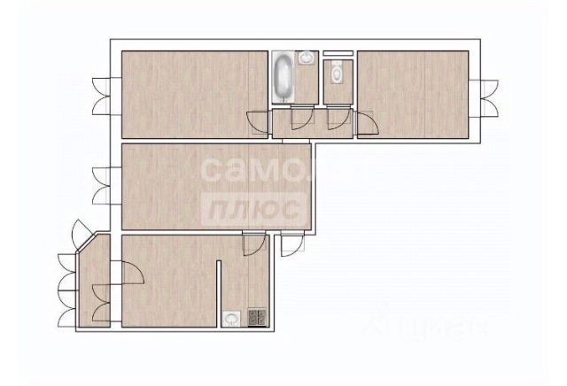 - справа от входа дверь в совмещённый санузел (имеется возможность отделения перегородкой унитаза и стиральной машины от раковины и ванны);