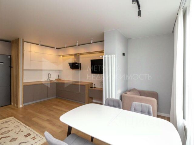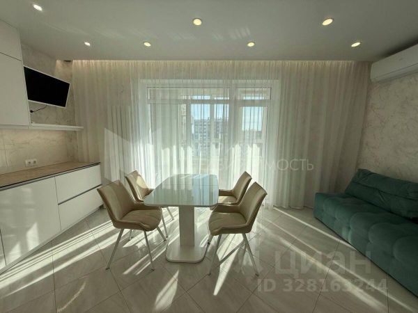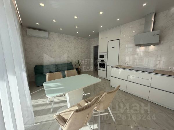 Просторная кухня-гостиная оборудована всей встроенной техникой Bosch: холодильник, варочная панель, вытяжка, духовой шкаф, микроволновая печь и посудомоечная машина, кондиционер "Haier", с эффектом драконий глаз, телевизор "Samsumg". стол раскладной, 4 стула, современный диван.