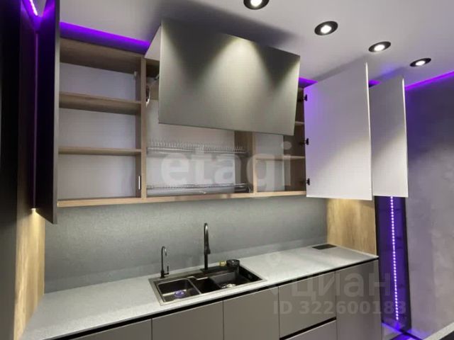Натяжной потолок со встроенным освещением и скрытыми гардинами. Межкомнатные двери Волховец, кухонный гарнитур и встроенная мебель фирмы Mr.Doors.