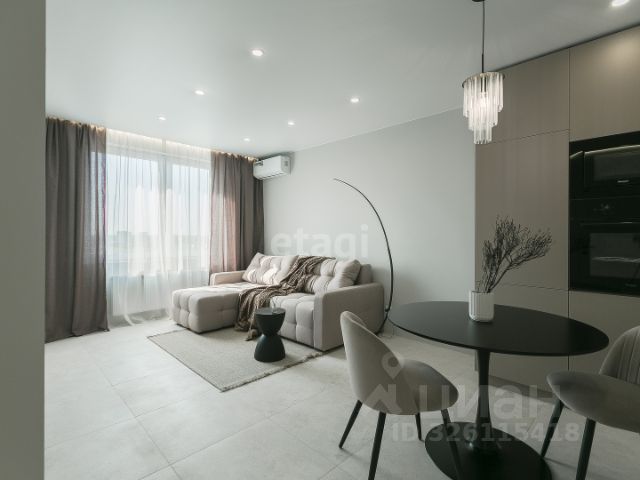 В кухне-гостиной: большой раскладной диван, телевизор, кондиционер. Кухня по дизайн-проекту с качественной встраиваемой техникой Weissgauff (варочная панель, духовой шкаф, микроволновая печь, холодильник, посудомоечная машина, вытяжка), уютная столовая зона (стол, мягкие стулья). Стиральная машинка расположена в закрытом пенале.