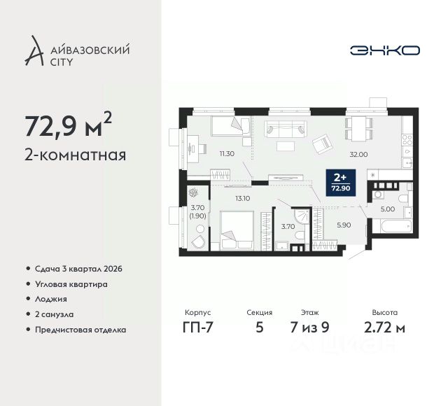 Продается 1-комн. квартира от застройщика с предчистовой отделкой в ЖК "Айвазовский City" на 11 этаже. Общая площадь: 40.14 кв.м., жилая: 14.07 кв.м., площадь просторной кухни-столовой: 15.94 кв.м. Все окна выходят на одну сторону. В квартире один совмещенный санузел. Высота потолков 2.7 м. Дом монолитный, многоподъездный, переменной этажности, от 8 до 24 этажей. Квартира находится в 5-й секции высотой 12 этажей в корпусе ГП-12. На этаже 5 квартир. В подъезде 1 пассажирский и 1 грузовой лифт. Окончание строительства - 4 квартал 2028 года. Оформление сделки по договору долевого участия. Новый жилой район располагается в живописном месте на берегу Туры в центральной части города. Принципиально новое пространство для жизни в центре современного города для тех, чьи мечты сбываются, кто нацелен на постоянный рост, перемены к лучшему для себя и своих близких. Каждая деталь Айвазовский City вдохновляет и заряжает на новые свершения: авторская архитектура, сбалансированная продуманная инфраструктура, дизайнерские дворы со спортивными и детскими площадками, парковые зоны с фонтанами, водный канал, украшающий центральный прогулочный маршрут района и многое другое. В 2019 года проект стал лауреатом престижной премии Urban Awards 2019 в номинации "Лучший строящийся региональный жилой комплекс бизнес-класса". Главная особенность Айвазовский City - соседство разных архитектурных школ в рамках одного дома. Изысканная классика, выразительная эклектика и оригинальный модерн - жить в одном из таких домов настоящий повод для гордости. Айвазовский City это идеальное сочетание комфорта, технологий и развитой инфраструктуры. Вход в подъезд возможен с улицы и со двора. Отправляясь на работу или за покупками, жители могут выйти с внешней стороны дома, а для прогулки с ребенком со стороны двора. Экологически чистые материалы и энергосберегающие технологии, качественное освещение общественных зон, видеонаблюдение по всей территории жилого района (в том числе в подъездах, лифтах и в подземном паркинге), закрытые дворы с доступом только для жителей Айвазовский City. Часть домов в Айвазовский City будут оснащены подземным паркингом. Востребованный в нашем климатическом поясе формат хранения автомобилей защитит собственность владельца в любое время года. Аккредитация в банках: ОАО "Альфа-Банк", ПАО "Газпромбанк", "Сбербанк России", ПАО Банк "ВТБ", ПАО "Промсвязьбанк" и других. #2MTEAc
