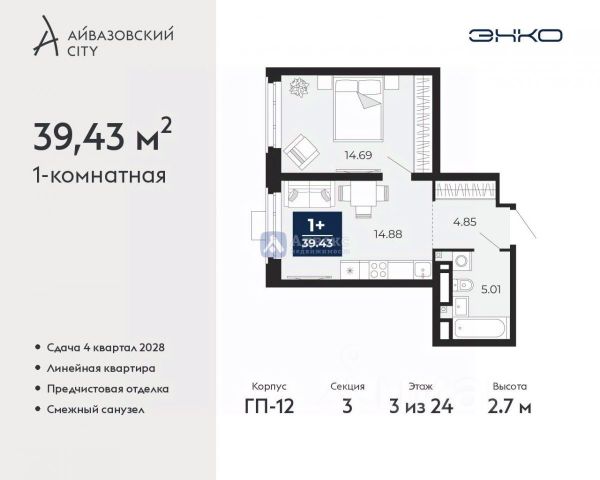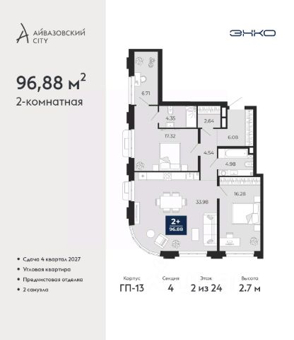 Двухкомнатная квартира от застройщика с предчистовой отделкой в ЖК "Айвазовский City" на 6 этаже. Общая площадь: 48.87 кв.м., жилая: 20.01 кв.м., площадь просторной кухни-столовой: 15.43 кв.м. Комнаты изолированные, все окна выходят на одну сторону. В квартире один совмещенный и один раздельный санузел. Высота потолков 2.7 м. Дом монолитный, многоподъездный, высотой 24 этажа. Квартира находится во 2-й секции в корпусе ГП-12. На этаже 6 квартир. В подъезде 1 пассажирский и 1 грузовой лифт. Окончание строительства - 4 квартал 2028 года. Оформление сделки по договору долевого участия. Новый жилой район располагается в живописном месте на берегу Туры в центральной части города. Принципиально новое пространство для жизни в центре современного города для тех, чьи мечты сбываются, кто нацелен на постоянный рост, перемены к лучшему для себя и своих близких. Каждая деталь Айвазовский City вдохновляет и заряжает на новые свершения: авторская архитектура, сбалансированная продуманная инфраструктура, дизайнерские дворы со спортивными и детскими площадками, парковые зоны с фонтанами, водный канал, украшающий центральный прогулочный маршрут района и многое другое. В 2019 года проект стал лауреатом престижной премии Urban Awards 2019 в номинации "Лучший строящийся региональный жилой комплекс бизнес-класса". Главная особенность Айвазовский City - соседство разных архитектурных школ в рамках одного дома. Изысканная классика, выразительная эклектика и оригинальный модерн - жить в одном из таких домов настоящий повод для гордости. Айвазовский City это идеальное сочетание комфорта, технологий и развитой инфраструктуры. Вход в подъезд возможен с улицы и со двора. Отправляясь на работу или за покупками, жители могут выйти с внешней стороны дома, а для прогулки с ребенком со стороны двора. Экологически чистые материалы и энергосберегающие технологии, качественное освещение общественных зон, видеонаблюдение по всей территории жилого района (в том числе в подъездах, лифтах и в подземном паркинге), закрытые дворы с доступом только для жителей Айвазовский City. Часть домов в Айвазовский City будут оснащены подземным паркингом. Востребованный в нашем климатическом поясе формат хранения автомобилей защитит собственность владельца в любое время года. Аккредитация в банках: ОАО "Альфа-Банк", ПАО Банк "ВТБ", "Сбербанк России", ПАО "Газпромбанк", АО "ДОМ.РФ" и других. #z68gCE