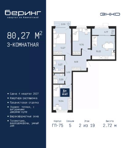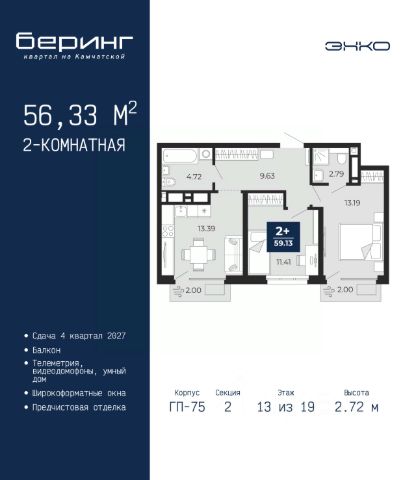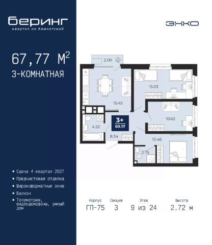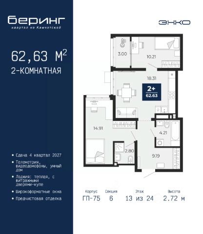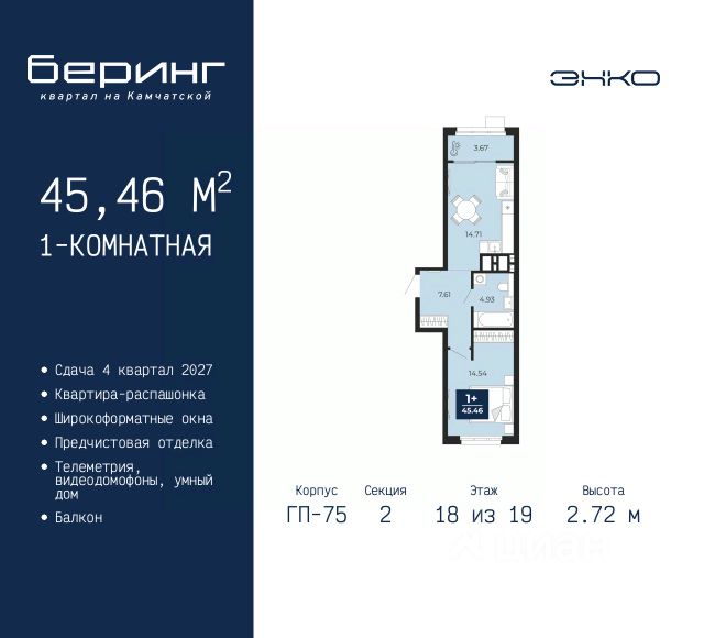 Однокомнатная квартира от застройщика с предчистовой отделкой в ЖК "Беринг" на 2 этаже. Общая площадь: 44.81 кв.м., жилая: 11.05 кв.м., площадь просторной кухни-столовой: 18.43 кв.м. Квартира угловая, идеально подойдет любителям тишины и панорамных видов. В квартире один балкон и одна лоджия, один совмещенный санузел. Высота потолков 2.72 м. Дом монолитный, многоподъездный, переменной этажности, от 17 до 24 этажей. Квартира находится в 1-й секции высотой 23 этажа в корпусе ГП-75. На этаже 8 квартир. В подъезде 2 пассажирских и 1 грузовой лифт. Окончание строительства - 4 квартал 2027 года. Оформление сделки по договору долевого участия. Подобно знаменитому исследователю, мы чувствуем себя первооткрывателями этой локации. Хотим показать новую суть места, сформировать для вас жизненный опыт, которого ещё не было. Беринг — район зелёного цвета. Беринг — район, который откроется вам с другой стороны. Впечатлит новым уровнем комфорта и качеством жизни. Беринг — открытие на карте города. Первый квартал расположен в районе Тура, в границах улиц: Камчатская Западносибирская Энтузиастов. Вокруг уже есть всё для того, чтобы ежедневная рутина была лишь частью жизни и не доставляла дискомфорта. Школы и детские сады, магазины и аптеки, поликлиника, места для семейного отдыха, пеших и велопрогулок, и даже рыбалки. Масштабное озеленение дворов — визитная карточка ЭНКО и ваш оазис спокойствия, чтобы отвлечься от повседневности. Раскидистые деревья, кустарники, травы и цветы — осталось остановиться, вдохнуть и расслабиться, глядя на эту природную красоту. Стилистика подъездов продолжает концепцию Беринга, вдохновлённого Камчаткой: сдержанный, но при этом впечатляющий дизайн соседствует с удобством и функциональностью. #zMg9wS