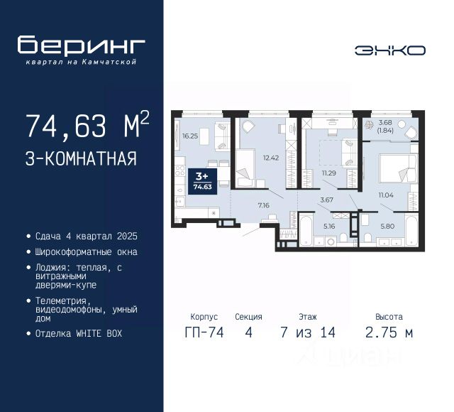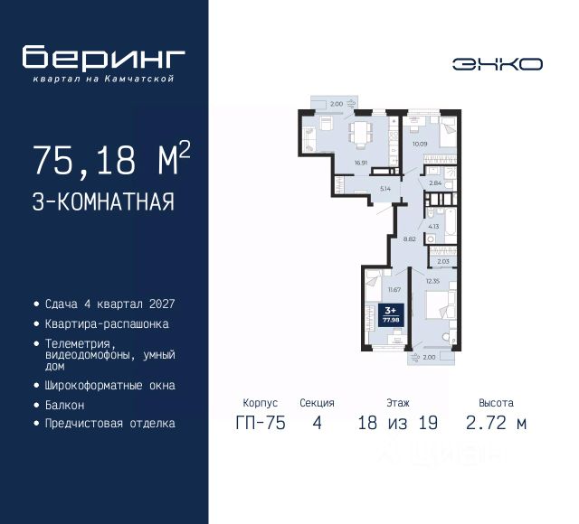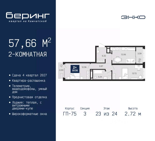 Двухкомнатная квартира с предчистовой отделкой в ЖК "Беринг" на 10 этаже. Общая площадь: 50.42 кв.м., жилая: 22.6 кв.м., площадь просторной кухни-столовой: 15.11 кв.м. Комнаты изолированные, все окна выходят на одну сторону. В квартире один балкон, один совмещенный санузел. Высота потолков 2.72 м. Дом монолитный, черырехподъездный, переменной этажности, от 19 до 24 этажей. Квартира находится во 2-й секции высотой 19 этажей в корпусе ГП-76. На этаже 8 квартир. В подъезде 1 пассажирский и 1 грузовой лифт. Окончание строительства - 4 квартал 2027 года. Оформление сделки по договору долевого участия. Подобно знаменитому исследователю, мы чувствуем себя первооткрывателями этой локации. Хотим показать новую суть места, сформировать для вас жизненный опыт, которого ещё не было. Беринг — район зелёного цвета. Беринг — район, который откроется вам с другой стороны. Впечатлит новым уровнем комфорта и качеством жизни. Беринг — открытие на карте города. Первый квартал расположен в районе Тура, в границах улиц: Камчатская Западносибирская Энтузиастов. Вокруг уже есть всё для того, чтобы ежедневная рутина была лишь частью жизни и не доставляла дискомфорта. Школы и детские сады, магазины и аптеки, поликлиника, места для семейного отдыха, пеших и велопрогулок, и даже рыбалки. Масштабное озеленение дворов — визитная карточка ЭНКО и ваш оазис спокойствия, чтобы отвлечься от повседневности. Раскидистые деревья, кустарники, травы и цветы — осталось остановиться, вдохнуть и расслабиться, глядя на эту природную красоту. Стилистика подъездов продолжает концепцию Беринга, вдохновлённого Камчаткой: сдержанный, но при этом впечатляющий дизайн соседствует с удобством и функциональностью. #ZmmC6v