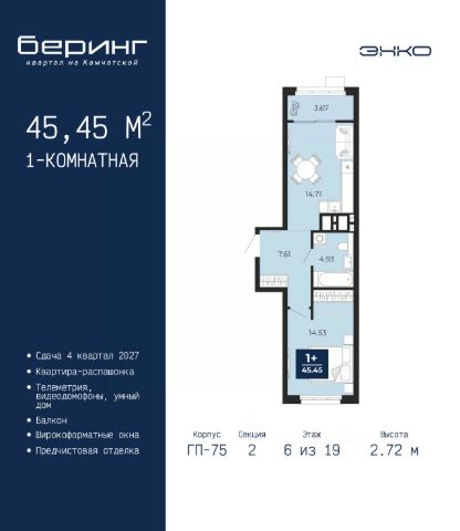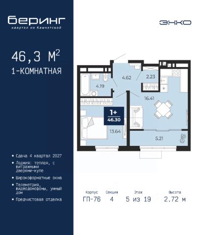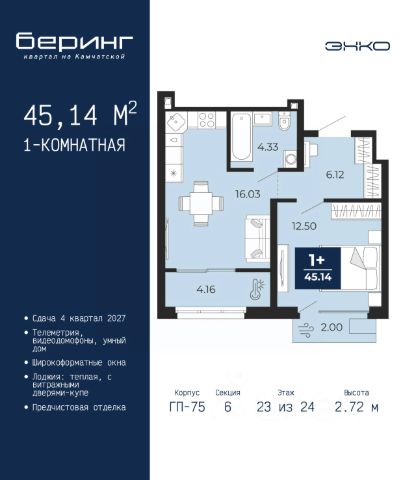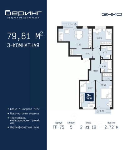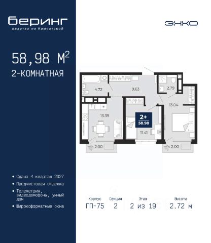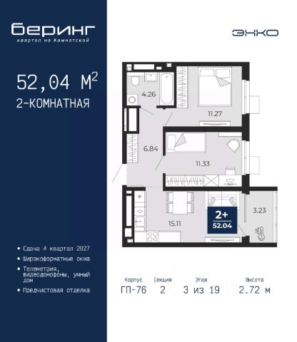 Просторная двухкомнатная квартира с предчистовой отделкой в ЖК "Беринг" на 2 этаже. Общая площадь: 56.1 кв.м. Высота потолков 2.72 м. Дом монолитный, многоподъездный, переменной этажности, от 17 до 24 этажей. Квартира находится в 4-й секции высотой 19 этажей в корпусе ГП-75. На этаже 4 квартиры. В подъезде 2 пассажирских и 1 грузовой лифт. Окончание строительства - 4 квартал 2027 года. Оформление сделки по договору долевого участия. Подобно знаменитому исследователю, мы чувствуем себя первооткрывателями этой локации. Хотим показать новую суть места, сформировать для вас жизненный опыт, которого ещё не было. Беринг — район зелёного цвета. Беринг — район, который откроется вам с другой стороны. Впечатлит новым уровнем комфорта и качеством жизни. Беринг — открытие на карте города. Первый квартал расположен в районе Тура, в границах улиц: Камчатская Западносибирская Энтузиастов. Вокруг уже есть всё для того, чтобы ежедневная рутина была лишь частью жизни и не доставляла дискомфорта. Школы и детские сады, магазины и аптеки, поликлиника, места для семейного отдыха, пеших и велопрогулок, и даже рыбалки. Масштабное озеленение дворов — визитная карточка ЭНКО и ваш оазис спокойствия, чтобы отвлечься от повседневности. Раскидистые деревья, кустарники, травы и цветы — осталось остановиться, вдохнуть и расслабиться, глядя на эту природную красоту. Стилистика подъездов продолжает концепцию Беринга, вдохновлённого Камчаткой: сдержанный, но при этом впечатляющий дизайн соседствует с удобством и функциональностью. #2mdebg