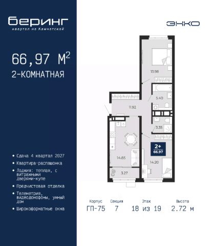Торопитесь забронировать по этой цене, предложение ограничено! Стоимость квартиры указана со скидкой, ваша экономия составит 820,463 руб. Звоните, мы вам все подробно расскажем. 2-комн. квартира от застройщика с предчистовой отделкой в ЖК "Беринг" на 1 этаже. Общая площадь: 66.59 кв.м., жилая: 21.58 кв.м., площадь просторной кухни-столовой: 21.4 кв.м. Комнаты изолированные, все окна выходят на одну сторону. В квартире один совмещенный и один раздельный санузел. Высота потолков 2.75 м. Дом монолитный, многоподъездный, переменной этажности, от 9 до 22 этажей. Квартира находится в 4-й секции высотой 12 этажей в корпусе ГП-73. На этаже 8 квартир. В подъезде 1 пассажирский и 1 грузовой лифт. В настоящее время строительство окончено, дом сдан в 1 квартале 2026 года. Оформление сделки по договору купли-продажи. Подобно знаменитому исследователю, мы чувствуем себя первооткрывателями этой локации. Хотим показать новую суть места, сформировать для вас жизненный опыт, которого ещё не было. Беринг — район зелёного цвета. Беринг — район, который откроется вам с другой стороны. Впечатлит новым уровнем комфорта и качеством жизни. Беринг — открытие на карте города. Первый квартал расположен в районе Тура, в границах улиц: Камчатская Западносибирская Энтузиастов. Вокруг уже есть всё для того, чтобы ежедневная рутина была лишь частью жизни и не доставляла дискомфорта. Школы и детские сады, магазины и аптеки, поликлиника, места для семейного отдыха, пеших и велопрогулок, и даже рыбалки. Масштабное озеленение дворов — визитная карточка ЭНКО и ваш оазис спокойствия, чтобы отвлечься от повседневности. Раскидистые деревья, кустарники, травы и цветы — осталось остановиться, вдохнуть и расслабиться, глядя на эту природную красоту. Стилистика подъездов продолжает концепцию Беринга, вдохновлённого Камчаткой: сдержанный, но при этом впечатляющий дизайн соседствует с удобством и функциональностью. #z6SfAw