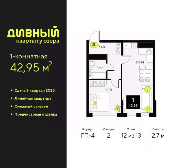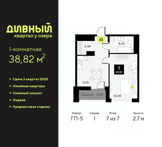 1-комн. квартира от застройщика с предчистовой отделкой в ЖК "Дивный квартал у озера" на 7 этаже. Общая площадь: 38.82 кв.м., жилая: 14.48 кв.м., площадь просторной кухни-столовой: 11.41 кв.м. Все окна выходят на одну сторону. В квартире одна лоджия, один совмещенный санузел. Высота потолков 2.7 м. Квартира будет сдаваться с предчистовой отделкой White Box: выровнены и оштукатурены стены, проведено электричество и отопление, установлены радиаторы. Вы также можете приобрести квартиру с ремонтом от застройщика, представленным в трех цветовых решениях Scandi, Wood и Coffee и включающим: ламинат, обои под покраску, двери, натяжной потолок, санузел с сантехникой. При желании вы можете заказать отделку под ключ, варианты возможных решений представлены в альбоме фотографий. Дом монолитный, черырехподъездный, переменной этажности, от 7 до 9 этажей. Квартира находится в 1-й секции высотой 7 этажей в корпусе ГП-5. На этаже 9 квартир. В подъезде 1 грузовой лифт. Окончание строительства - 4 квартал 2025 года. Оформление сделки по договору долевого участия. "Дивный квартал у озера" современный жилой квартал, удобно расположенный в 10-ти минутах от центра Тюмени, в уютном районе рядом с зеленым массивом и озером Алебашево. Комплекс находится между улицами Мельникайте и Алебашевская, что обеспечивает его хорошую транспортную доступность до центра на автомобиле всего 10 минут. Рядом с комплексом расположен Лесопарк имени Гагарина, экзотический Парк дружбы между Россией и Республикой Корея. "Дивный квартал у озера" объединяет архитектуру современной городской застройки и природную эстетику. Уютные дворы жилого комплекса будут не только безопасными, но и тихими. Закрытая территория надёжно защищена от шума и посторонних глаз. Здесь будут места для отдыха, детские площадки, зоны для выгула собак. В холлах первого этажа расположены мягкая зона ожидания, общественные санузлы и просторная колясочная. Квартал будет располагать богатой инфраструктурой: на первых этажах домов разместятся магазины, пекарни, кофейни, пункты выдачи, аптеки, детские центры, цветочные салоны и многое другое, что сделает жизнь поистине комфортной. В комплексе есть теплый подземный паркинг и кладовые. #24aVDd