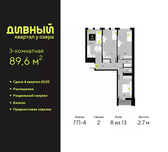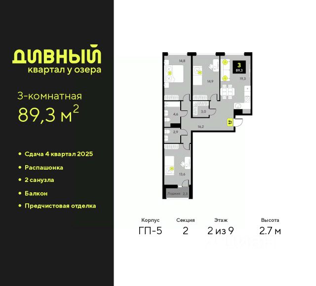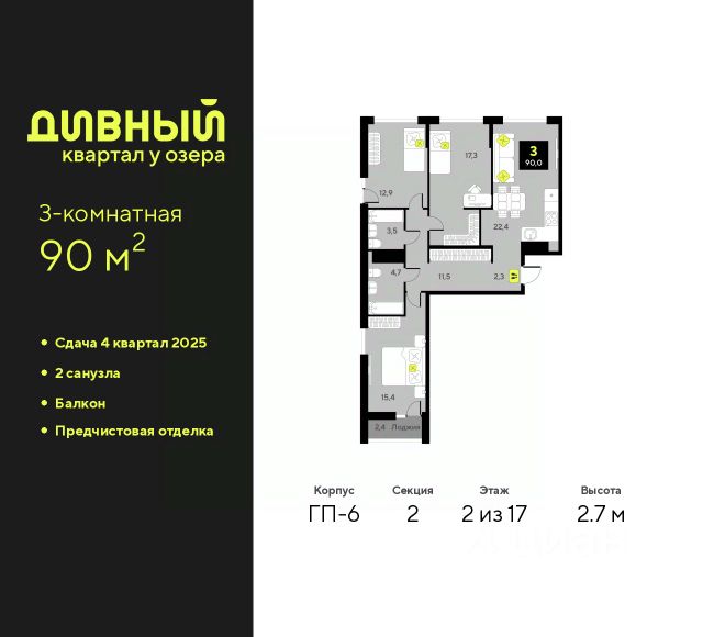 Трехкомнатная квартира с предчистовой отделкой в ЖК "Дивный квартал у озера" на 8 этаже. Общая площадь: 89 кв.м., жилая: 47.1 кв.м., площадь просторной кухни-столовой: 19.1 кв.м. Квартира - распашонка, без проходных комнат, окна выходят на paзные стороны дома. В квартире один балкон, один раздельный санузел. Высота потолков 2.7 м. Квартира будет сдаваться с предчистовой отделкой White Box: выровнены и оштукатурены стены, проведено электричество и отопление, установлены радиаторы. Вы также можете приобрести квартиру с ремонтом от застройщика, представленным в трех цветовых решениях Scandi, Wood и Coffee и включающим: ламинат, обои под покраску, двери, натяжной потолок, санузел с сантехникой. При желании вы можете заказать отделку под ключ, варианты возможных решений представлены в альбоме фотографий. Дом монолитный, черырехподъездный, переменной этажности, от 7 до 9 этажей. Квартира находится в 3-й секции высотой 9 этажей в корпусе ГП-5. На этаже 5 квартир. В подъезде 1 пассажирский и 1 грузовой лифт. Окончание строительства - 4 квартал 2025 года. Оформление сделки по договору долевого участия. "Дивный квартал у озера" современный жилой квартал, удобно расположенный в 10-ти минутах от центра Тюмени, в уютном районе рядом с зеленым массивом и озером Алебашево. Комплекс находится между улицами Мельникайте и Алебашевская, что обеспечивает его хорошую транспортную доступность до центра на автомобиле всего 10 минут. Рядом с комплексом расположен Лесопарк имени Гагарина, экзотический Парк дружбы между Россией и Республикой Корея. "Дивный квартал у озера" объединяет архитектуру современной городской застройки и природную эстетику. Уютные дворы жилого комплекса будут не только безопасными, но и тихими. Закрытая территория надёжно защищена от шума и посторонних глаз. Здесь будут места для отдыха, детские площадки, зоны для выгула собак. В холлах первого этажа расположены мягкая зона ожидания, общественные санузлы и просторная колясочная. Квартал будет располагать богатой инфраструктурой: на первых этажах домов разместятся магазины, пекарни, кофейни, пункты выдачи, аптеки, детские центры, цветочные салоны и многое другое, что сделает жизнь поистине комфортной. В комплексе есть теплый подземный паркинг и кладовые. #Z6gAcD