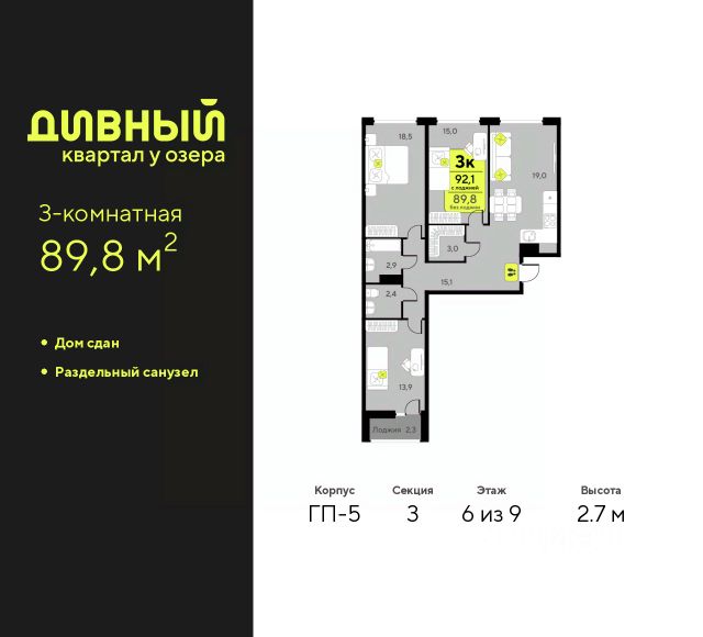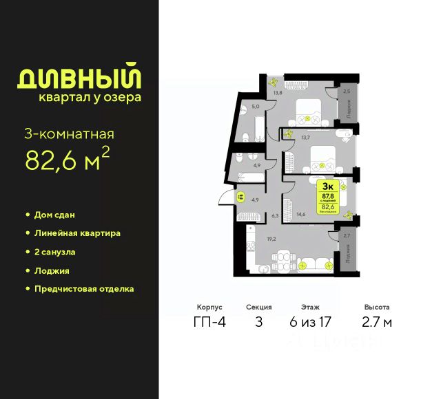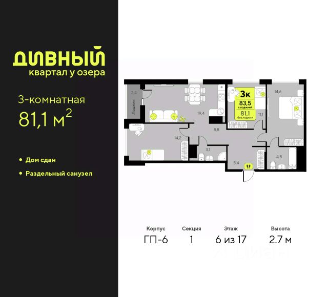 3-комн. квартира от застройщика с предчистовой отделкой в ЖК "Дивный квартал у озера" на 6 этаже. Общая площадь: 81.1 кв.м., жилая: 39.9 кв.м., площадь просторной кухни-столовой: 19.4 кв.м. Угловая квартира, окна oбecпeчивaют paвнoмepнoe ocвeщeниe в тeчeниe дня. В квартире одна лоджия, один совмещенный и один раздельный санузел. Высота потолков 2.7 м. Квартира будет сдаваться с предчистовой отделкой White Box: выровнены и оштукатурены стены, проведено электричество и отопление, установлены радиаторы. Вы также можете приобрести квартиру с ремонтом от застройщика, представленным в трех цветовых решениях Scandi, Wood и Coffee и включающим: ламинат, обои под покраску, двери, натяжной потолок, санузел с сантехникой. При желании вы можете заказать отделку под ключ, варианты возможных решений представлены в альбоме фотографий. Дом монолитный, трехподъездный, переменной этажности, от 9 до 17 этажей. Квартира находится в 1-й секции высотой 17 этажей в корпусе ГП-6. На этаже 8 квартир. В подъезде 1 пассажирский и 1 грузовой лифт. В настоящее время строительство окончено, дом сдан в 4 квартале 2025 года. Оформление сделки по договору купли-продажи. "Дивный квартал у озера" современный жилой квартал, удобно расположенный в 10-ти минутах от центра Тюмени, в уютном районе рядом с зеленым массивом и озером Алебашево. Комплекс находится между улицами Мельникайте и Алебашевская, что обеспечивает его хорошую транспортную доступность до центра на автомобиле всего 10 минут. Рядом с комплексом расположен Лесопарк имени Гагарина, экзотический Парк дружбы между Россией и Республикой Корея. "Дивный квартал у озера" объединяет архитектуру современной городской застройки и природную эстетику. Уютные дворы жилого комплекса будут не только безопасными, но и тихими. Закрытая территория надёжно защищена от шума и посторонних глаз. Здесь будут места для отдыха, детские площадки, зоны для выгула собак. В холлах первого этажа расположены мягкая зона ожидания, общественные санузлы и просторная колясочная. Квартал будет располагать богатой инфраструктурой: на первых этажах домов разместятся магазины, пекарни, кофейни, пункты выдачи, аптеки, детские центры, цветочные салоны и многое другое, что сделает жизнь поистине комфортной. В комплексе есть теплый подземный паркинг и кладовые. #2t1SCm