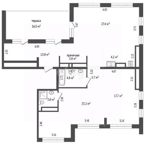 Просторная прихожая квадратной формы, где удобно расположить зоны хранения, ближайшая ко входу комната - кухня-столовая-гостиная почти 21 кв.м с витражным окном и французским балконом, гостевой сан.узел, по левую сторону две детских комнаты почти по 11 кв.м, по правую большая мастер-спальня 16.7 кв.м с витражным окном и ещё одним французским балконом, между комнатами располагается большой приватный сан.узел и гардеробная комната (она может стать так же хозяйственно-постирочной).