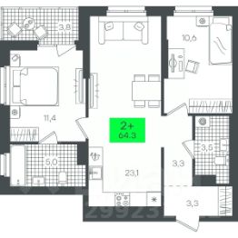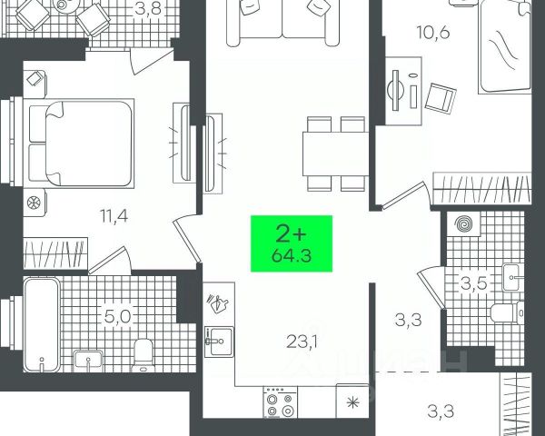 + высота потолков 3.3 метра, дает много воздуха и пространства