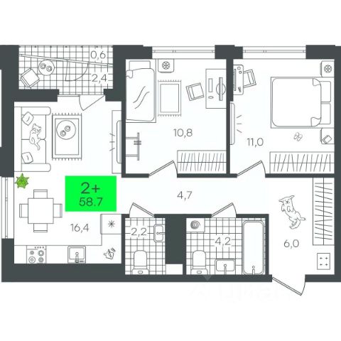 прекрасная квартира формата 1+ отличной планировки. Просторная кухня-гостиная 23,6 м. кв. с выходом на остекленную лоджию. Спальная комната площадью 15,8 кв.м., где можно дополнительно разместить гардеробную. Так же на входе в квартиру - удобная ниша под гардероб. Совместный сан.узел, где можно вместить всё самое необходимое. В квартире выполнена улучшенная черновая отделка: ровные светлые стены, финишная стяжка пола, разводка всех коммуникаций, установлены счетчики: вода, электричество (телеметрия), тепло. На площадке всего 6 квартир, Шикарный вид из окна - на пешеходный бульвар и эко-парк. Закрытая система двора, видеонаболюдение, сквозные подъезды, на первом этаже- колясочная и санузел. Удачное расположение дома, рядом с будущим эко-парком. В пешей доступности - школы, сады, поликлиника. Звоните, договоримся о просмотре!