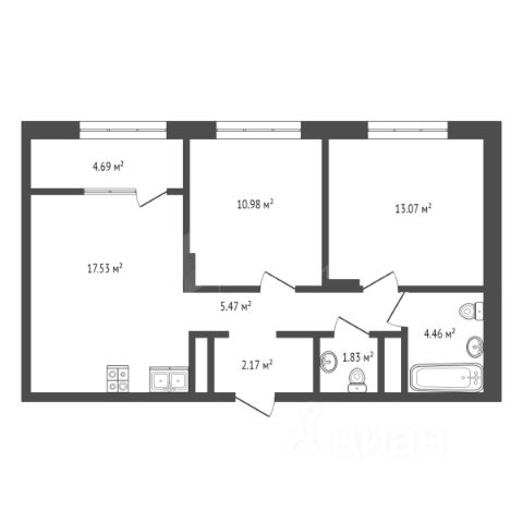 Простор и свет: Большая кухня-гостиная 17.5 м² — сердце квартиры, где так здорово собираться всей семьей. А с лоджии открывается вид на лес — ваш личный уголок природы.