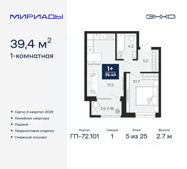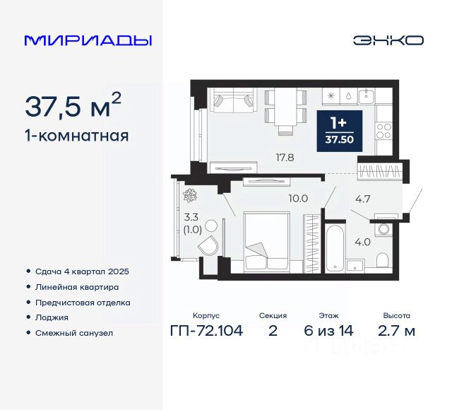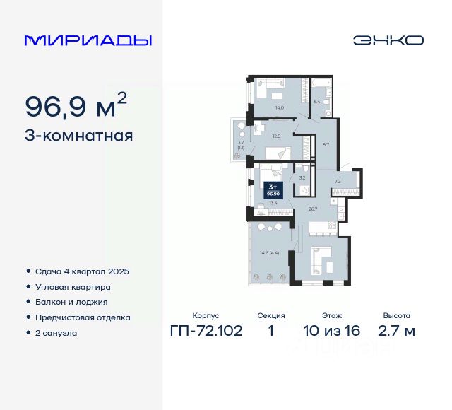 Продается 2-комн. квартира с предчистовой отделкой в ЖК "Мириады" на 14 этаже. Общая площадь: 58.6 кв.м., жилая: 24.2 кв.м., площадь просторной кухни-столовой: 14.9 кв.м. Комнаты изолированные, все окна выходят на одну сторону. В квартире одна лоджия, два совмещенных санузла. Высота потолков 2.7 м. Дом монолитный, многоподъездный, переменной этажности, от 14 до 16 этажей. Квартира находится во 2-й секции высотой 16 этажей в корпусе ГП-72.102. На этаже 6 квартир. В подъезде 1 пассажирский и 1 грузовой лифт. Окончание строительства - 4 квартал 2025 года. Оформление сделки по договору долевого участия. Вселенная бесконечных историй. Ранее невиданный Тюмени масштаб: территория 240 гектаров и 1 650 000 м² застройки. Мириады это город масштабных перемен и больших возможностей. Город зеленых рощ и зеркальных озер. Город для работы, учебы и развлечений. Город для детей и их родителей. Город для всех и каждого. Проект расположен в районе Мыс рядом с ТРЦ "Тюмень Сити Молл" в границах улицы Тимофея Чаркова, Тобольского тракта и объездной дороги. Срок полного освоения территории - до 2034 года. #Z6teAA