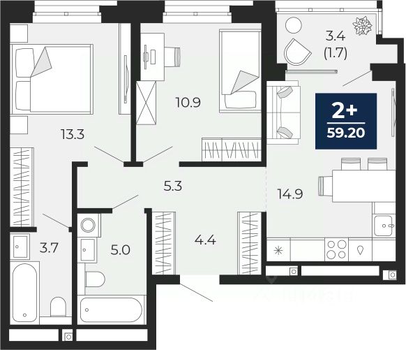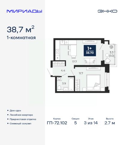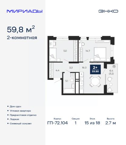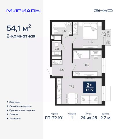 Просторная двухкомнатная квартира с предчистовой отделкой в ЖК "Мириады" на 7 этаже. Общая площадь: 59.2 кв.м., жилая: 24.2 кв.м., площадь просторной кухни-столовой: 14.9 кв.м. Комнаты изолированные, все окна выходят на одну сторону. В квартире одна лоджия, два совмещенных санузла. Высота потолков 2.7 м. Дом монолитный, многоподъездный, переменной этажности, от 14 до 16 этажей. Квартира находится во 2-й секции высотой 16 этажей в корпусе ГП-72.102. На этаже 6 квартир. В подъезде 1 пассажирский и 1 грузовой лифт. В настоящее время строительство окончено, дом сдан в 4 квартале 2025 года. Оформление сделки по договору купли-продажи. Вселенная бесконечных историй. Ранее невиданный Тюмени масштаб: территория 240 гектаров и 1 650 000 м² застройки. Мириады это город масштабных перемен и больших возможностей. Город зеленых рощ и зеркальных озер. Город для работы, учебы и развлечений. Город для детей и их родителей. Город для всех и каждого. Проект расположен в районе Мыс рядом с ТРЦ "Тюмень Сити Молл" в границах улицы Тимофея Чаркова, Тобольского тракта и объездной дороги. Срок полного освоения территории - до 2034 года. #ZMcC8g