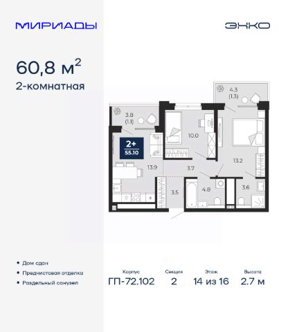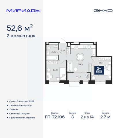 Продается двухкомнатная квартира с европланировкой и предчистовой отделкой в ЖК "Мириады" на 8 этаже. Общая площадь: 40.12 кв.м., жилая: 21.05 кв.м., суммарная площадь гостиной-столовой с кухонной зоной: 15.5 кв.м. Европейская планировка, в просторной кухне-гостиной удобно как готовить, так и отдыхать. Комнаты изолированные, все окна выходят на одну сторону. В квартире одна лоджия, один совмещенный санузел. Высота потолков 2.7 м. Дом монолитный, двухподъездный, переменной этажности, от 14 до 16 этажей. Квартира находится во 2-й секции высотой 16 этажей в корпусе ГП-72.107. На этаже 10 квартир. В подъезде 1 пассажирский и 1 грузовой лифт. Окончание строительства - 3 квартал 2028 года. Оформление сделки по договору долевого участия. Вселенная бесконечных историй. Ранее невиданный Тюмени масштаб: территория 240 гектаров и 1 650 000 м² застройки. Мириады это город масштабных перемен и больших возможностей. Город зеленых рощ и зеркальных озер. Город для работы, учебы и развлечений. Город для детей и их родителей. Город для всех и каждого. Проект расположен в районе Мыс рядом с ТРЦ "Тюмень Сити Молл" в границах улицы Тимофея Чаркова, Тобольского тракта и объездной дороги. Срок полного освоения территории - до 2034 года. #zMdgdV
