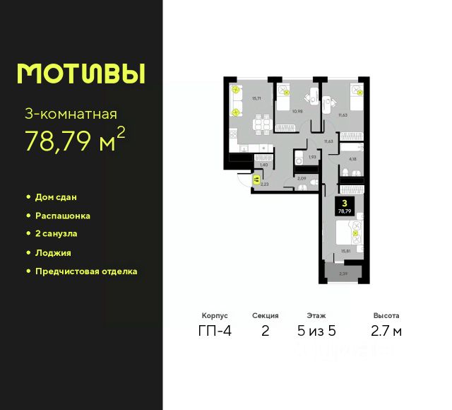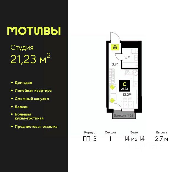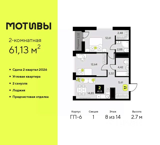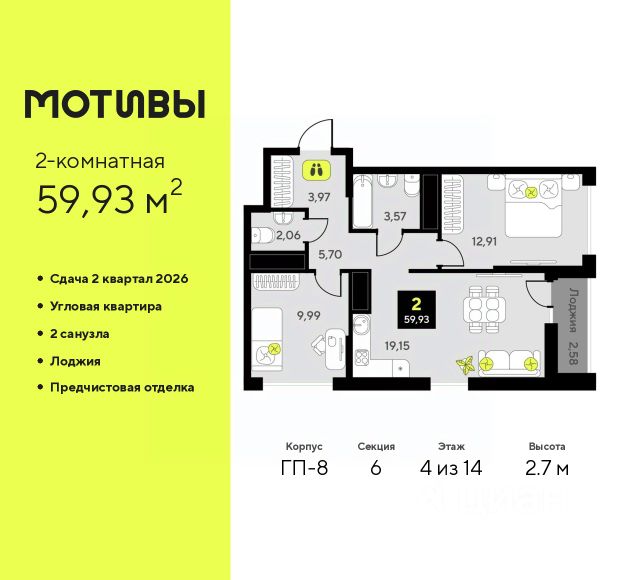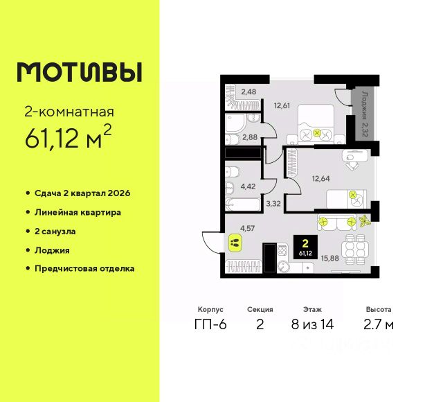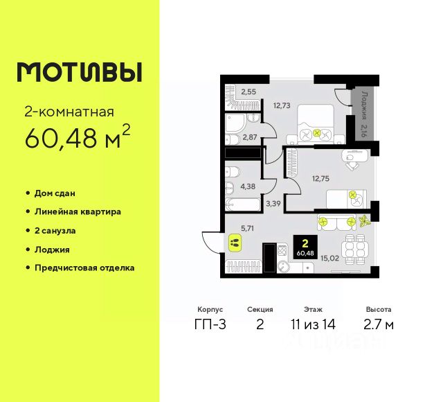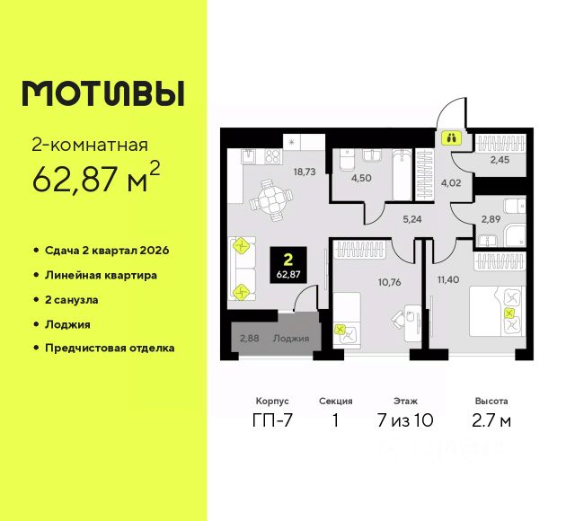 Продается 2-комн. квартира с предчистовой отделкой в ЖК "Мотивы" на 7 этаже. Общая площадь: 62.87 кв.м., жилая: 22.16 кв.м., площадь просторной кухни-столовой: 18.73 кв.м. Комнаты изолированные, все окна выходят на одну сторону. В квартире одна лоджия, два совмещенных санузла. Высота потолков 2.7 м. Квартира будет сдаваться с предчистовой отделкой White Box: выровнены и оштукатурены стены, проведено электричество и отопление, установлены радиаторы. Вы также можете приобрести квартиру с ремонтом от застройщика, представленным в трех цветовых решениях Scandi, Wood и Coffee и включающим ламинат, обои под покраску, двери, натяжной потолок и санузел с сантехникой. При желании вы можете заказать отделку под ключ, варианты возможных решений представлены в альбоме фотографий. Дом монолитный, трехподъездный, высотой 10 этажей. Квартира находится в 1-й секции в корпусе ГП-7. На этаже 5 квартир. В подъезде 1 пассажирский и 1 грузовой лифт. Окончание строительства - 2 квартал 2026 года. Оформление сделки по договору долевого участия. Закрытая от автомобилей территория, безопасный двор и камеры видеонаблюдения - гаранты вашего спокойствия. Квартал будет располагать богатой инфраструктурой: на первых этажах разместятся магазины, пекарни, кофейни, пункты выдачи, аптеки, детские центры, цветочные салоны и многое другое, что сделает жизнь поистине комфортной. Рядом находится парк общей площадью почти 5000 м², в котором располагаются локации для игр и отдыха жителей, здесь можно совершить утреннюю пробежку или прогуляться после рабочего дня. В парке есть зона воркаута с тренажерами для взрослых, игровые комплексы с горками и канатный комплекс для детей разных возрастов, качели и лавочки для отдыха, площадки для командных видов спорта и для панна-футбола. В ЖК "Мотивы" всё продумано до мелочей: светлые холлы входных групп, оформленные в едином стиле, просторные колясочные, лапомойки для питомцев. На территории комплекса находятся 2 8-ми этажных паркинга и более 1000 м/м на открытой парковке. Жилой комплекс находится в одном из экологически благоприятных районов Тюмени, недалеко от Плехановского бора. При этом до центра города можно добраться за 15 минут, а до международного аэропорта Рощино за 13 минут. Окончание строительства: ГП 1, 2, 3, 4 сдача до конца 2024 года, ГП 6, 7, 8 сдача 2 квартал 2026 года. #Z4dD9V