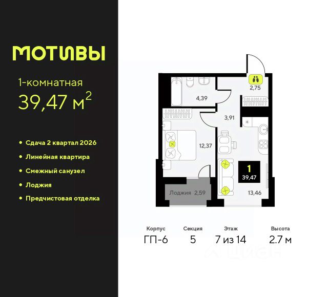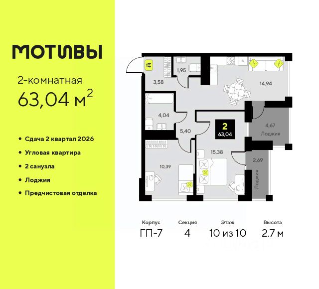 Продается 2-комн. квартира с предчистовой отделкой в ЖК "Мотивы" на 13 этаже. Общая площадь: 62.87 кв.м., жилая: 22.16 кв.м., площадь просторной кухни-столовой: 18.73 кв.м. Комнаты изолированные, все окна выходят на одну сторону. В квартире одна лоджия, два совмещенных санузла. Высота потолков 2.7 м. Квартира будет сдаваться с предчистовой отделкой White Box: выровнены и оштукатурены стены, проведено электричество и отопление, установлены радиаторы. Вы также можете приобрести квартиру с ремонтом от застройщика, представленным в трех цветовых решениях Scandi, Wood и Coffee и включающим ламинат, обои под покраску, двери, натяжной потолок и санузел с сантехникой. При желании вы можете заказать отделку под ключ, варианты возможных решений представлены в альбоме фотографий. Дом монолитный, черырехподъездный, переменной этажности, от 12 до 14 этажей. Квартира находится в 4-й секции высотой 14 этажей в корпусе ГП-8. На этаже 5 квартир. В подъезде 1 пассажирский и 1 грузовой лифт. Окончание строительства - 2 квартал 2026 года. Оформление сделки по договору долевого участия. Закрытая от автомобилей территория, безопасный двор и камеры видеонаблюдения - гаранты вашего спокойствия. Квартал будет располагать богатой инфраструктурой: на первых этажах разместятся магазины, пекарни, кофейни, пункты выдачи, аптеки, детские центры, цветочные салоны и многое другое, что сделает жизнь поистине комфортной. Рядом находится парк общей площадью почти 5000 м², в котором располагаются локации для игр и отдыха жителей, здесь можно совершить утреннюю пробежку или прогуляться после рабочего дня. В парке есть зона воркаута с тренажерами для взрослых, игровые комплексы с горками и канатный комплекс для детей разных возрастов, качели и лавочки для отдыха, площадки для командных видов спорта и для панна-футбола. В ЖК "Мотивы" всё продумано до мелочей: светлые холлы входных групп, оформленные в едином стиле, просторные колясочные, лапомойки для питомцев. На территории комплекса находятся 2 8-ми этажных паркинга и более 1000 м/м на открытой парковке. Жилой комплекс находится в одном из экологически благоприятных районов Тюмени, недалеко от Плехановского бора. При этом до центра города можно добраться за 15 минут, а до международного аэропорта Рощино за 13 минут. Окончание строительства: ГП 1, 2, 3, 4 сдача до конца 2024 года, ГП 6, 7, 8 сдача 2 квартал 2026 года. #Z4ageD
