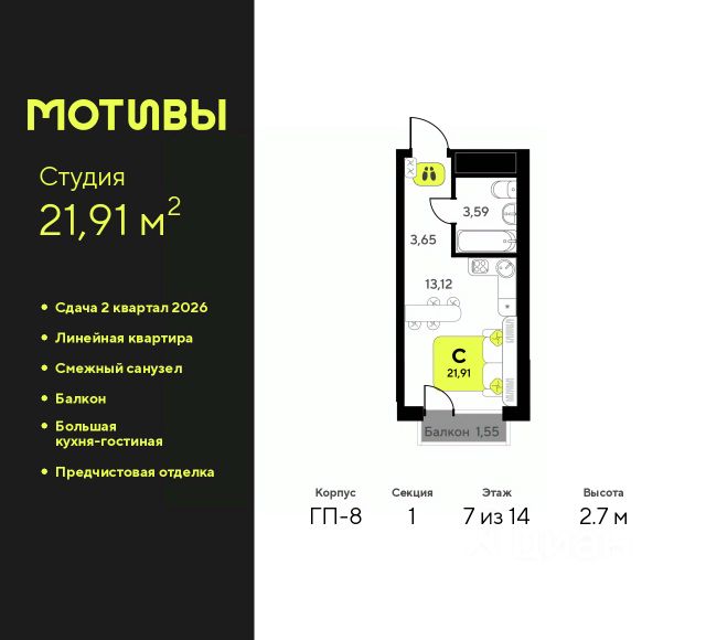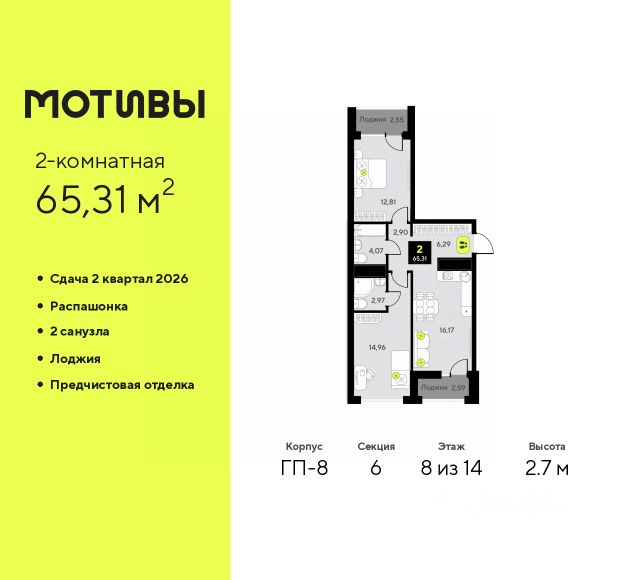 Продается 2-комн. квартира от застройщика с предчистовой отделкой в ЖК "Мотивы" на 2 этаже. Общая площадь: 54.64 кв.м., жилая: 23.82 кв.м., площадь просторной кухни-столовой: 19.89 кв.м. Комнаты изолированные, все окна выходят на одну сторону. В квартире одна лоджия, один совмещенный санузел. Высота потолков 2.7 м. Квартира будет сдаваться с предчистовой отделкой White Box: выровнены и оштукатурены стены, проведено электричество и отопление, установлены радиаторы. Вы также можете приобрести квартиру с ремонтом от застройщика, представленным в трех цветовых решениях Scandi, Wood и Coffee и включающим ламинат, обои под покраску, двери, натяжной потолок и санузел с сантехникой. При желании вы можете заказать отделку под ключ, варианты возможных решений представлены в альбоме фотографий. Дом монолитный, черырехподъездный, переменной этажности, от 12 до 14 этажей. Квартира находится в 6-й секции высотой 14 этажей в корпусе ГП-8. На этаже 12 квартир. В подъезде 1 пассажирский и 1 грузовой лифт. Окончание строительства - 2 квартал 2026 года. Оформление сделки по договору долевого участия. Закрытая от автомобилей территория, безопасный двор и камеры видеонаблюдения - гаранты вашего спокойствия. Квартал будет располагать богатой инфраструктурой: на первых этажах разместятся магазины, пекарни, кофейни, пункты выдачи, аптеки, детские центры, цветочные салоны и многое другое, что сделает жизнь поистине комфортной. Рядом находится парк общей площадью почти 5000 м², в котором располагаются локации для игр и отдыха жителей, здесь можно совершить утреннюю пробежку или прогуляться после рабочего дня. В парке есть зона воркаута с тренажерами для взрослых, игровые комплексы с горками и канатный комплекс для детей разных возрастов, качели и лавочки для отдыха, площадки для командных видов спорта и для панна-футбола. В ЖК "Мотивы" всё продумано до мелочей: светлые холлы входных групп, оформленные в едином стиле, просторные колясочные, лапомойки для питомцев. На территории комплекса находятся 2 8-ми этажных паркинга и более 1000 м/м на открытой парковке. Жилой комплекс находится в одном из экологически благоприятных районов Тюмени, недалеко от Плехановского бора. При этом до центра города можно добраться за 15 минут, а до международного аэропорта Рощино за 13 минут. Окончание строительства: ГП 1, 2, 3, 4 сдача до конца 2024 года, ГП 6, 7, 8 сдача 2 квартал 2026 года. #zM9B1d