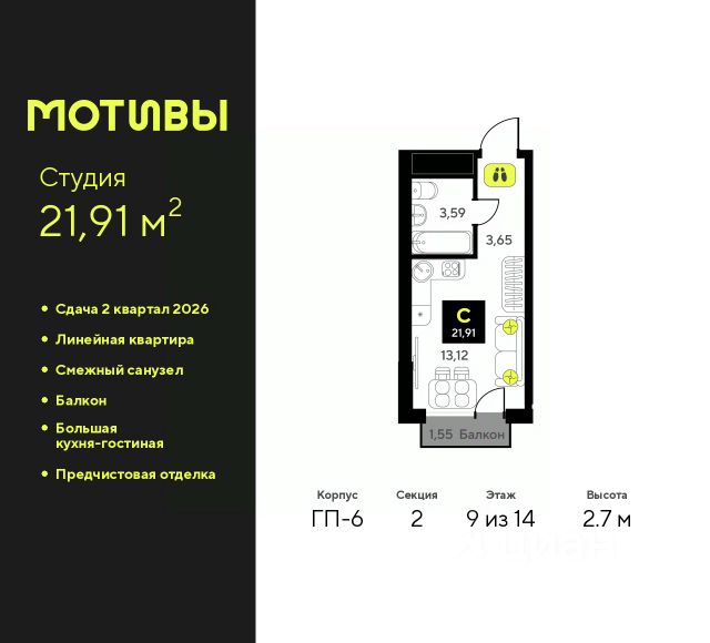 Просторная 1-комн. квартира в ЖК "Мотивы" на 14 этаже. Общая площадь: 35.85 кв.м. Высота потолков 2.7 м. Квартира предоставляется в чистовой отделке: на полу ламинат, на стенах флизелиновые обои под покраску, санузел отделан плиткой, установлена вся сантехника, краны, смесители, душевые лейки и т.д., также в комплектацию входит кондиционер, видеодомофон, вызывная панель домофона уже установлена и подключена к работе. Выбирая место для жизни, вы хотите, чтобы оно было лучше и удобнее. Мы же хотим, чтобы каждый смог получить все, что пожелает при переезде в новый дом. Это наша цель, миссия и главный мотив. Пара шагов от дома и вы оказываетесь в парке, где можно совершить утреннюю пробежку или неспешно прогуляться после рабочего дня. Подъезды в домах сквозные, а входные группы расположены на уровне тротуара - в дом удобно заходить как с улицы, так и со двора. Домофон в тёплом тамбуре не позволит вам замёрзнуть, пока вы открываете двери. А хорошее настроение обеспечат светлые холлы, оформленные в едином стиле. Больше никакой грязи в квартире. Велосипеды и коляски можно оставить в колясочных, которые мы сделали по-настоящему просторными. А обладатели четверногих друзей смогут помыть их лапки после прогулки в специально оборудованных лапомойных комнатах. Квартира с видом на бескрайний природный простор или на урбанистический пейзаж? Легко! Мы создали безопасный двор, где можно без лишних тревог оставить детей играть во дворе. Закрытая от автомобилей территория и камеры видеонаблюдения - гарант вашего спокойствия. #2wAc9B