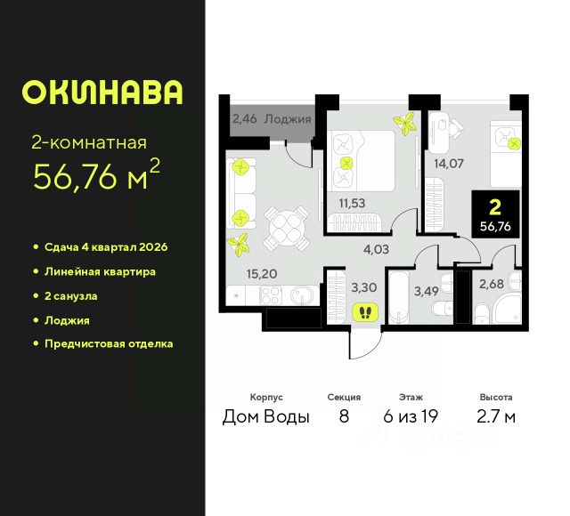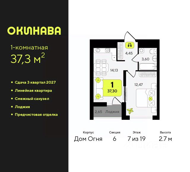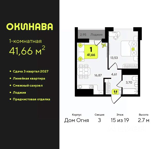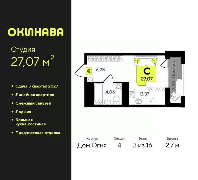 Двухкомнатная квартира от застройщика с предчистовой отделкой в ЖК "Окинава" на 3 этаже. Общая площадь: 67.71 кв.м., жилая: 29.3 кв.м., площадь просторной кухни-столовой: 13.83 кв.м. Квартира угловая, идеально подойдет любителям тишины и панорамных видов. В квартире одна лоджия, один совмещенный и один раздельный санузел. Высота потолков 2.7 м. Квартира будет сдана с предчистовой отделкой: на полах стяжка под финишное покрытие, стены подготовлены под покраску или оклейку обоями, разведена вся электрика с подготовкой для установки выключателей и освещения. При желании вы можете заказать отделку под ключ, варианты возможных решений представлены в альбоме фотографий. Дом монолитный, многоподъездный, переменной этажности, от 13 до 19 этажей. Квартира находится в 1-й секции высотой 19 этажей в корпусе Дом Огня. На этаже 5 квартир. В подъезде 1 пассажирский и 1 грузовой лифт. Окончание строительства - 3 квартал 2027 года. Оформление сделки по договору долевого участия. ЖК "Окинава" это не просто жилой комплекс, это остров 4 стихий. Они отражаются во внешнем виде фасадов домов, обустройстве дворов и внутреннем оформлении холлов. Каждая из стихий это отдельный дом. Между домами раскинется большой двухуровневый пешеходный бульвар. Первый уровень прогулочный с местами для отдыха, амфитеатром и фонтанами. На втором уровне расположатся площадки для детей, спортивных игр и тренировок. Квартал будет располагать богатой инфраструктурой: на первых этажах разместятся магазины, пекарни, кофейни, пункты выдачи, аптеки, детские центры, цветочные салоны и многое другое, что сделает жизнь поистине комфортной. В жилом комплексе есть кладовые, а также несколько видов паркинга: уличный гостевой, закрытый теплый и паркинг в стилобате, попасть в который можно на лифте с любого жилого этажа. Дворы в каждом доме отражают его стихию, отличаясь по наполнению. Они дополняют друг друга, образуя единое дворовое пространство жилого комплекса. Закрытая территория, свободная от автомобилей, обеспечит безопасность и спокойный отдых. Холлы оформлены керамогранитом, зеркалами и разноуровневым освещением. Витражные входные группы, мягкие зоны ожидания, видеонаблюдение 24/7, вместительные колясочные и даже лапомойки для питомцев всё это будет в ЖК "Окинава". Жилой комплекс "Окинава" находится в активно развивающемся V заречном микрорайоне, недалеко от озера Алебашево, где в будущем расположится масштабный ивент-парк с зонами отдыха. Удобная транспортная развязка позволит добраться до центра всего за 15 минут. #z4EUM8