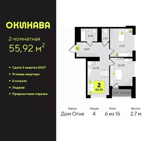 Двухкомнатная квартира с предчистовой отделкой в ЖК "Окинава" на 8 этаже. Общая площадь: 55.96 кв.м., жилая: 24.02 кв.м., площадь просторной кухни-столовой: 14.78 кв.м. Квартира угловая, идеально подойдет любителям тишины и панорамных видов. В квартире одна лоджия, один совмещенный и один раздельный санузел. Высота потолков 2.7 м. Квартира будет сдана с предчистовой отделкой: на полах стяжка под финишное покрытие, стены подготовлены под покраску или оклейку обоями, разведена вся электрика с подготовкой для установки выключателей и освещения. При желании вы можете заказать отделку под ключ, варианты возможных решений представлены в альбоме фотографий. Дом монолитный, многоподъездный, переменной этажности, от 11 до 19 этажей. Квартира находится в 3-й секции высотой 13 этажей в корпусе Дом Воды. На этаже 6 квартир. В подъезде 1 пассажирский и 1 грузовой лифт. Окончание строительства - 4 квартал 2026 года. Оформление сделки по договору долевого участия. ЖК "Окинава" это не просто жилой комплекс, это остров 4 стихий. Они отражаются во внешнем виде фасадов домов, обустройстве дворов и внутреннем оформлении холлов. Каждая из стихий это отдельный дом. Между домами раскинется большой двухуровневый пешеходный бульвар. Первый уровень прогулочный с местами для отдыха, амфитеатром и фонтанами. На втором уровне расположатся площадки для детей, спортивных игр и тренировок. Квартал будет располагать богатой инфраструктурой: на первых этажах разместятся магазины, пекарни, кофейни, пункты выдачи, аптеки, детские центры, цветочные салоны и многое другое, что сделает жизнь поистине комфортной. В жилом комплексе есть кладовые, а также несколько видов паркинга: уличный гостевой, закрытый теплый и паркинг в стилобате, попасть в который можно на лифте с любого жилого этажа. Дворы в каждом доме отражают его стихию, отличаясь по наполнению. Они дополняют друг друга, образуя единое дворовое пространство жилого комплекса. Закрытая территория, свободная от автомобилей, обеспечит безопасность и спокойный отдых. Холлы оформлены керамогранитом, зеркалами и разноуровневым освещением. Витражные входные группы, мягкие зоны ожидания, видеонаблюдение 24/7, вместительные колясочные и даже лапомойки для питомцев всё это будет в ЖК "Окинава". Жилой комплекс "Окинава" находится в активно развивающемся V заречном микрорайоне, недалеко от озера Алебашево, где в будущем расположится масштабный ивент-парк с зонами отдыха. Удобная транспортная развязка позволит добраться до центра всего за 15 минут. #2MiCtc