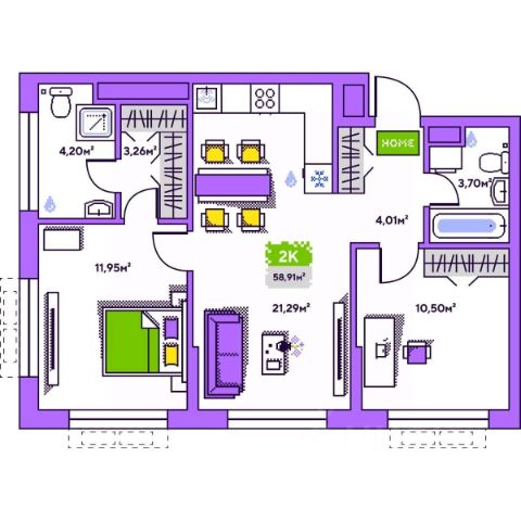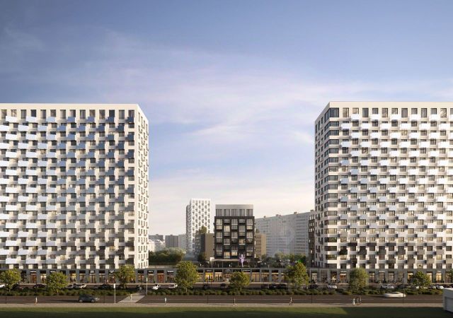 19-этажная архитектурная доминанта с эффектом паруса и камерная секция: французские балконы, сити-хаусы на 1-м этаже, 9 этажей в доме. Уступчатая структура формирует динамичный силуэт — новый акцент ул. Полевая. Металлические балконы создают градиент от тёмного к светлому, большие окна — панорамные виды на город.