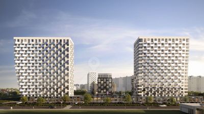 19-этажная архитектурная доминанта с эффектом паруса и камерная секция: французские балконы, сити-хаусы на 1-м этаже, 9 этажей в доме. Уступчатая структура формирует динамичный силуэт — новый акцент ул. Полевая. Металлические балконы создают градиент от тёмного к светлому, большие окна — панорамные виды на город.