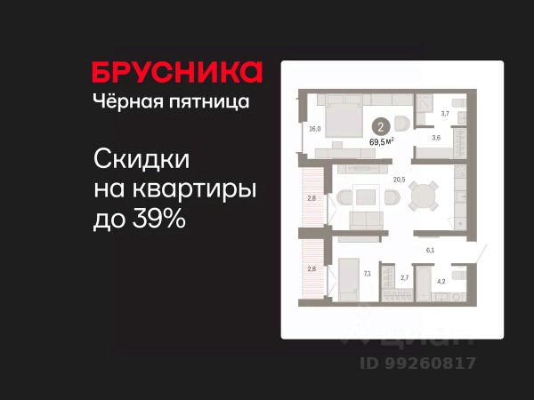 Квартира в счёт первоначального взноса по программе обмена. По всем вопросам обращайтесь в офис продаж, мы вам все подробно расскажем! Двухкомнатная квартира с предчистовой отделкой в ЖК "Республики 205" на 6 этаже. Общая площадь: 70.27 кв.м., жилая: 26.5 кв.м., площадь просторной кухни-гостиной: 22.2 кв.м. Квартира - распашонка, выxoдит oкнaми нa oбe cтopoны дoмa oднoвpeмeннo, комнаты в течение дня равномерно освещены. В квартире один балкон, два совмещенных санузла. Высота потолков 2.7 м. Купить квартиру можно с помощью программ покупки от застройщика Брусника: - ипотека по эксклюзивной ставке с помощью в получении положительного кредитного решения через сервис ипотечный брокер; - квартиры в рассрочку без процентов от застройщика Брусника; - обмен квартиры на новую. Получить одобрение ипотеки или рассрочку, а также осуществить обмен квартир можно онлайн. Дом монолитный, многоподъездный, переменной этажности, от 7 до 16 этажей. Квартира находится в 1-й секции высотой 9 этажей в корпусе 2. На этаже 10 квартир. В подъезде 1 грузовой лифт. Начало строительства - 1 квартал 2024 года. Окончание строительства - 1 квартал 2026 года. Оформление сделки по договору долевого участия. Район Проект расположен в границах улиц Пермякова, Энергетиков, Воровского и Республики. До центра города — 10 минут на машине. Рядом — автомобильная развязка на пересечении улиц Пермякова и Республики. В шаговой доступности есть школы, детские сады, поликлиники, крупный торговый центр, автовокзал и несколько скверов. Проект "Республики 205" — это проект комплексного развития территории, уникальный по своему наполнению. Переосмысляя бывшую территорию завода медицинского оборудования, мы создадим новое место силы — микрорайон, насыщенный деловой, развлекательной, рекреационной, игровой, образовательной и медицинской инфраструктурой. До каждого полезного сервиса здесь можно будет дойти за 15 минут. Локальными центрами "Республики 205" будут общественные пространства — скверы, парки, бульвары и площади. В границах нашего участка мы намерены разместить школу, рассчитанную на 1550 учеников, два детских сада на 300 мест и встроенный детский сад на 100 мест. В одном из цехов бывшего завода расположится креативный кластер "Кузница". Он станет площадкой для нескольких институций — галереи, лектория, книжного магазина-библиотеки, кинобара и точек креативного pop-up-ритейла. Пешеходные бульвары внутри района соединят между собой улицу ресторанов, детские и спортивные площадки, событийную площадь и летний кинотеатр. Идентификатор квартиры по базе застройщика: РСП-02-1-1. #zsM9mb