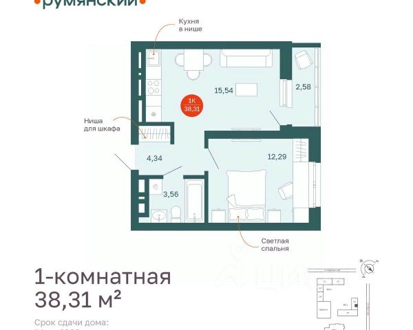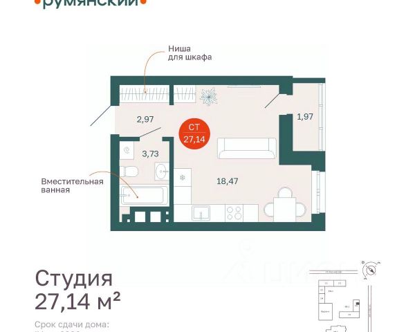 Квартира формата 1+ (кухня-гостиная и одна спальня) с качественным ремонтом расположена в новом жилом комплексе "Румянский" в центральной части города. Общая площадь увеличена за счет просторного панорамного балкона (4 м²), откуда открывается вид на город. Планировка включает кухню-гостиную с большим окном, отдельную спальню и современный санузел, отделанный керамогранитом. В санузле установлена ванна, тропический душ, инсталляция, унитаз, зеркало с подсветкой, предусмотрены выводы под стиральную машину. В квартире никто еще не проживал, все коммуникации и отделка — в идеальном состоянии.