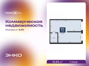 Помещение свободного назначения на 1 этаже, общая площадь 52.83 кв.м. Стоимость помещения 16,050,000 руб., цена за кв.м 303,804 руб.