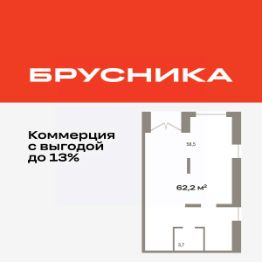 Помещение свободного назначения на 1 этаже, общая площадь 62.22 кв.м., без отделки. Стоимость помещения 14,330,000 руб., цена за кв.м 230,311 руб.