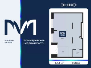 Помещение свободного назначения на 1 этаже, общая площадь 64.1 кв.м., без отделки. Стоимость помещения 16,820,000 руб., цена за кв.м 262,402 руб.