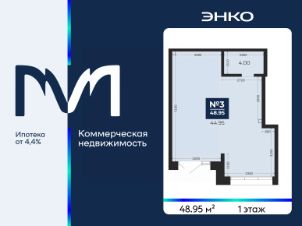 Помещение свободного назначения на 1 этаже, общая площадь 48.95 кв.м. Стоимость помещения 11,100,000 руб., цена за кв.м 226,762 руб.
