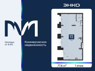 Помещение свободного назначения на 1 этаже, общая площадь 77.6 кв.м. Стоимость помещения 19,240,000 руб., цена за кв.м 247,938 руб.