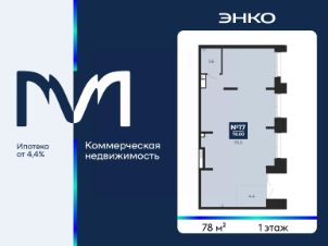 Помещение свободного назначения на 1 этаже, общая площадь 78 кв.м. Стоимость помещения 19,350,000 руб., цена за кв.м 248,076 руб.
