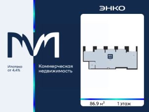 Помещение свободного назначения на 1 этаже, общая площадь 86.9 кв.м. Стоимость помещения 20,615,000 руб., цена за кв.м 237,226 руб.