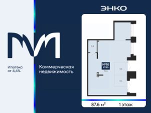 Помещение свободного назначения на 1 этаже, общая площадь 87.6 кв.м. Стоимость помещения 20,620,000 руб., цена за кв.м 235,388 руб.
