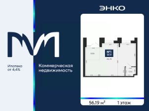 Помещение свободного назначения на 1 этаже, общая площадь 56.19 кв.м. Стоимость помещения 12,170,000 руб., цена за кв.м 216,586 руб.