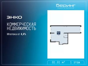 Помещение свободного назначения на 1 этаже, общая площадь 81.01 кв.м., без отделки. Стоимость помещения 14,941,000 руб., цена за кв.м 184,434 руб.