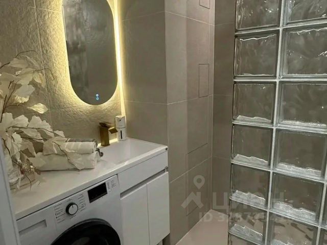 Ремонт выполнен из дорогих и качественных материалов: в санузле выложены 3д стеклоблоки с проекцией при попадании света, санузел и пол на балконе выложен керамогранитом, пол в комнате выложен кварцвинилом елочкой, плинтуса дюполимер выкрашены в цвет стен. В санузле организован ряд подсветок: парящий потолок, подсветка полочек, спот. На балконе поменяны рамы и стеклопакеты, утеплены стены и потолок.