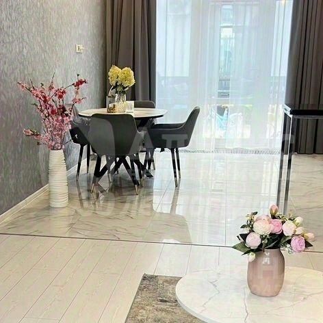 В танхаусе выполнен качественный и стильный ремонт по дизайн проекту, материалы дорогие и закупались не в целях экономии. На идеально ровных стенах, дорогие обои и фреска, ламинат высокого класса прочности. Керамагранит в санузлах отличается высоким качеством от производителя и так же идеально подобран. Встроенная мебель и техника от ведущих производителей. Все светильники и домашний текстиль выполнялись под заказ в соответствии с дизайн проектом