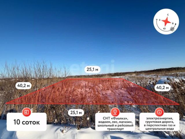 Участок 10 соток в СНТ "Фиалка" (земля населенных пунктов) Идеальная основа для дома вашей мечты. Участок правильной формы, свободен от строений, с готовым межеванием — можно сразу приступать к проектированию и строительству. Главные преимущества: Статус земли: Земля населенных пунктов — самые востребованные и перспективные участки. Коммуникации: В СНТ уже заключен договор на газификацию и идет прокладка централизованного водопровода. Инфраструктура и транспорт: Круглогодичное проживание соседей. До остановки школьного и общественного транспорта — 5-8 минут пешком. К участку ведет дорога с твердым покрытием. Отдых и природа: Рядом озера Разбахта и Липовое, а также лес с грибами и ягодами. Участок полностью готов к строительству. Отличный выбор для постоянного проживания в черте города с развитой инфраструктурой и природой рядом. МЫ ГАРАНТИРУЕМ ФИНАНСОВУЮ БЕЗОПАСНОСТЬ ДЛЯ НАШИХ КЛИЕНТОВ. Код пользователя: 195164 Номер в базе: 11747157